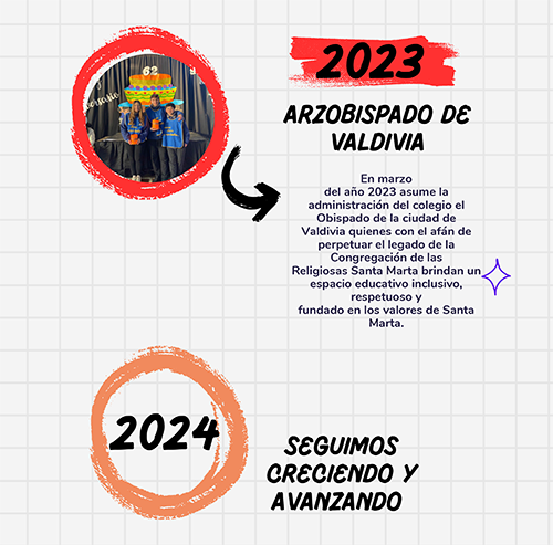 Así se continúa trabajando hasta el año 2022 cuando la Congregación de Religiosas de Santa Marta anuncian su retiro de la ciudad. Es así como en marzo del año 2023 asume la administración del colegio el Obispado de la ciudad de Valdivia quienes con el afán de perpetuar el legado de la Congregación de las Religiosas Santa Marta brindan un espacio educativo inclusivo, respetuoso y fundado en los valores de Santa Marta.
